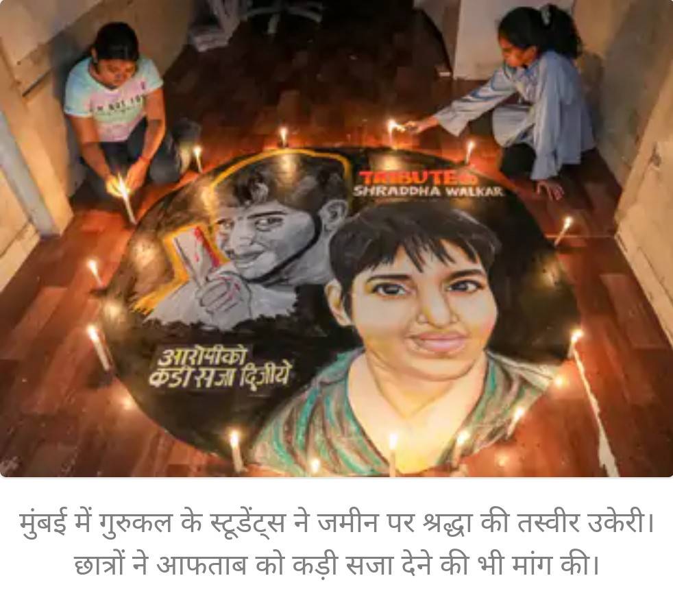 मुंबई में गुरुकल के स्टूडेंट्स ने जमीन पर श्रद्धा की तस्वीर उकेरी। छात्रों ने आफताब को कड़ी सजा देने की भी मांग की।