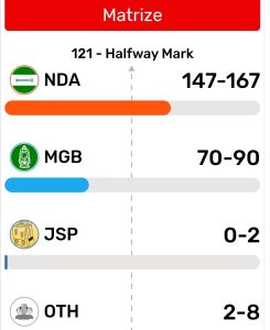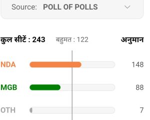 पोल्स ऑफ पोल्स (3 एगिज्ट पोल्स) में एनडीए जबरदस्त वापसी करते हुए 138-155 सीटें पा सकता है. वहीं महागठबंधन को 82-98, जनसुराज को 0-2 था अन्य के खाते में 3-7 सीटों का अनुमान है.