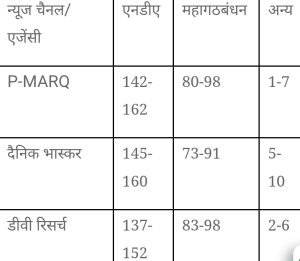 P-MARQ के एग्जिट पोल में में भी एनडीए को जबरदस्त बहुमत मिलता दिख रहा है. इसके मुताबिक, एनडीए को 142-162 सीटें, महागठबंधन को 80-98 सीटें तथा प्रशांत किशोर की जन सुराज को 1-4 और अन्य के खाते में 0-3 सीटें जाने का अनुमान है.