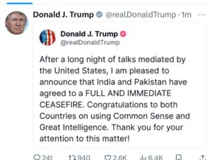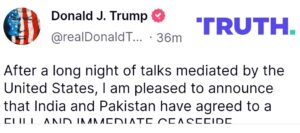 डोनाल्ड ट्रंप ने 10 मई 2025 को अपने सोशल मीडिया प्लेटफॉर्म ट्रूथ सोशल पर भारत और पाकिस्तान के बीच युद्धविराम की घोषणा करते हुए निम्नलिखित पोस्ट किया.