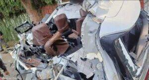 पेड़ से टकराने के बाद रुकी कार: इस टक्कर में कार की छत ट्रक के पिछले हिस्से में जा घुसी. लेकिन कार की गति अभी भी काफी अधिक थी इसलिए कार जबरदस्त टक्कर के बाद भी रुकी नहीं और आगे बढ़ती गई.यहां तक कि कार की छत उधड़ती चली गई और कार सवारों की गर्दन कट गई. इतनी जबरदस्त टक्कर के बाद भी कार रुकी नहीं और आगे जाकर पेड़ से जा टकराई. इस टक्कर के बाद कार का अगला हिस्सा इंजन समेत ड्राइवर सीट तक चला गया.