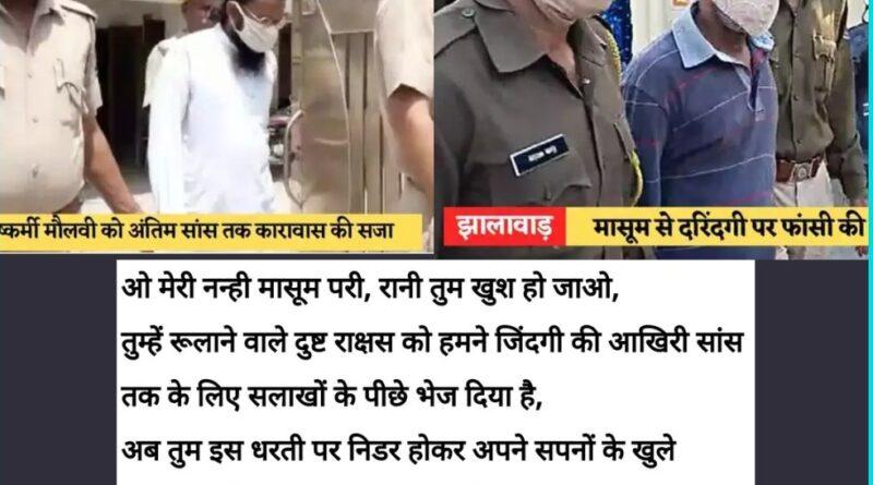 राजस्थान के कोटा में मंगलवार को दुष्कर्मी मौलवी को कोर्ट ने अंतिम सांस तक कारावास की सजा सुनाई है। अभियुक्त ने छह साल की मासूम बालिका को अपनी हवस शिकार बनाया था। कोर्ट ने उसे उसके कर्मों की सजा सुनाई, जो उसे मरते दम तक भुगतनी होगी। दरिंदे को यह सजा पांच महीने पहले 6 छह साल की मासूम बालिका से दरिंदगी करने पर पाॅक्सो कोर्ट-3 ने सुनाई। विशिष्ट न्यायाधीश दीपक दुबे ने समाज को भावुक करने वाली कविता भी फैसले के आदेश की काॅपी में लिखी। पीड़ित बच्ची को हौसले की उड़ान और नई जिंदगी खुशहाल होकर जीने के लिए प्रेरित करने वाली कविता लिखी। न्यायाधीश दीपक दुबे लिखते हैं,