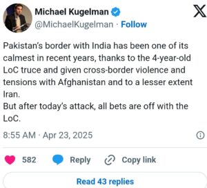 2021 में भारत और पाकिस्तान के बीच नियंत्रण रेखा (LoC) पर संघर्ष विराम हुआ था। इससे सीमा पर होने वाली गोलीबारी कम हो गई थी। लेकिन, अब यह समझौता टूटने के कगार पर है। साउथ एशिया के एक्सपर्ट माइकल कुगेलमैन ने X पर लिखा, ‘LoC को लेकर अब कोई शर्त नहीं है।’