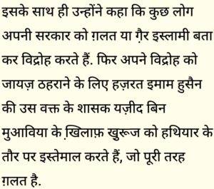 इसके साथ ही उन्होंने कहा कि कुछ लोग अपनी सरकार को ग़लत या गै़र इस्लामी बता कर विद्रोह करते हैं. फिर अपने विद्रोह को जायज़ ठहराने के लिए हज़रत इमाम हुसैन की उस वक्त के शासक यज़ीद बिन मुआविया के खि़लाफ़ खु़रूज को हथियार के तौर पर इस्तेमाल करते हैं, जो पूरी तरह ग़लत है.