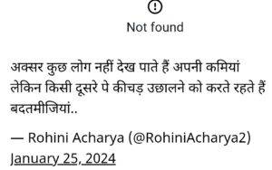 रोहिणी यहीं तक नहीं रूकी। उन्होंने आगे लिखा कि अक्सर कुछ लोग नहीं देख पाते हैं अपनी कमियां। लेकिन किसी दूसरे पे कीचड़ उछालने को करते रहते हैं बदतमीजियां ।