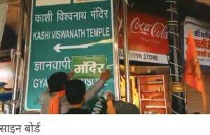 इस बीच रात में कुछ युवकों ने ज्ञानवापी की तरफ जाने वाले मार्ग पर लगे साइन बोर्ड पर ‘ज्ञानवापी मंदिर मार्ग’ लिख दिया. जिसकी तस्वीर वायरल हो रही है.