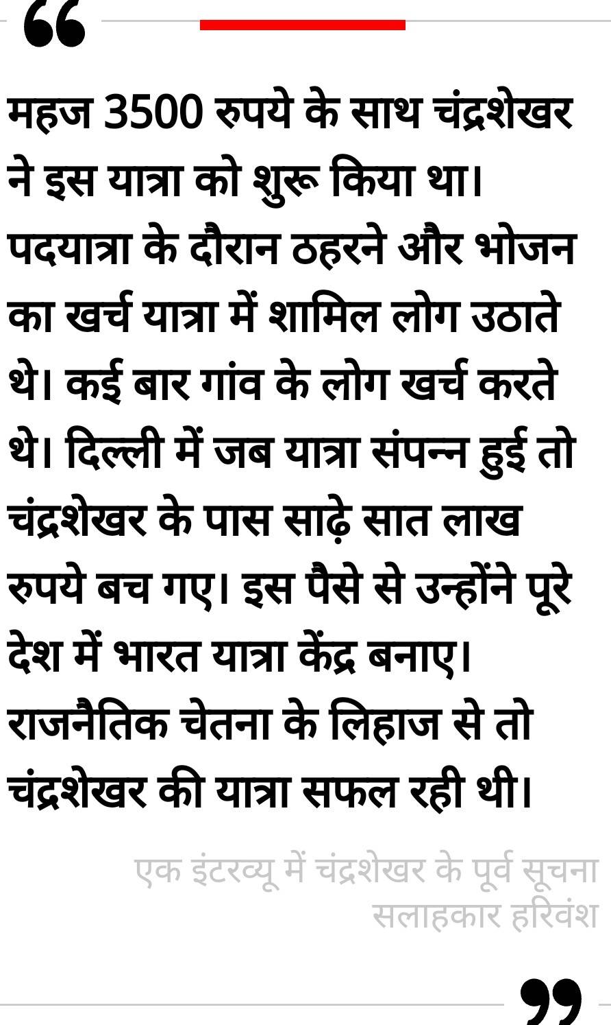 चंद्रशेखर- द लास्ट आइकन ऑफ आइडियोलॉजिकल पॉलिटिक्स का हवाला देते हुए हरिवंश ने इंटरव्यू में बताया था, ‘महज 3500 रुपये के साथ चंद्रशेखर ने इस यात्रा को शुरू किया था। पदयात्रा के दौरान ठहरने और भोजन का खर्च यात्रा में शामिल लोग उठाते थे। कई बार गांव के लोग खर्च करते थे। दिल्ली में जब यात्रा संपन्न हुई तो चंद्रशेखर के पास साढ़े सात लाख रुपये बच गए। इस पैसे से उन्होंने पूरे देश में भारत यात्रा केंद्र बनाए। राजनैतिक चेतना के लिहाज से तो चंद्रशेखर की यात्रा सफल रही थी। देश के तमाम इलाकों में यात्रा को समर्थन भी मिला लेकिन दिल्ली में अपेक्षा के मुताबिक जनप्रतिक्रिया नहीं मिली। पदयात्रा समाप्त होने के अगले दिन चंद्रशेखर रामलीला मैदान पहुंचे।’
