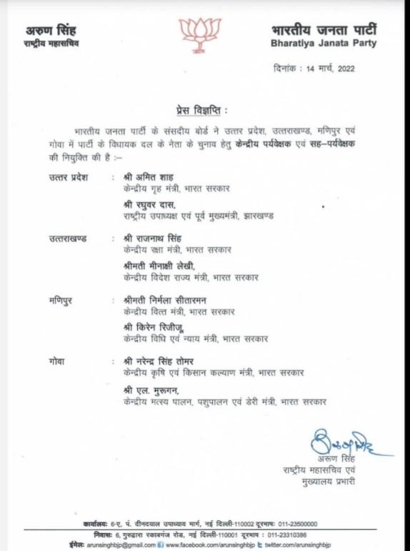 भाजपा ने चार राज्यों में नियुक्त किए पर्यवेक्षक, अमित शाह को यूपी, राजनाथ सिंह को उत्तराखंड और नरेंद्र सिंह तोमर को गोवा की कमान