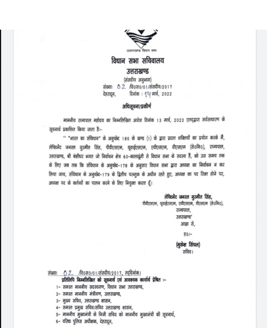 उत्तराखंड की पांचवीं विधानसभा के गठन के लिए वरिष्ठ विधायक बंशीधर भगत को प्रोटेम स्पीकर बनाया गया है। राज्यपाल लेफ्टिनेंट जनरल गुरमीत सिंह (सेवानिवृत्त) ने कालाढूंगी से विधायक चुने गए बंशीधर को नया विधानसभा अध्यक्ष चुने जाने तक प्रोटेम स्पीकर नियुक्त किया है। इस संबंध में राज्यपाल ने अधिसूचना जारी कर दी है।