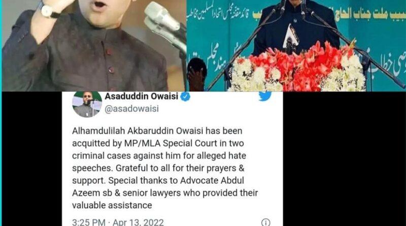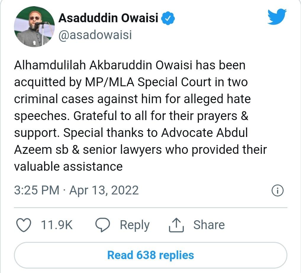 Alhamdulilah Akbaruddin Owaisi has been acquitted by MP/MLA Special Court in two criminal cases against him for alleged hate speeches. Grateful to all for their prayers & support. Special thanks to Advocate Abdul Azeem sb & senior lawyers who provided their valuable assistance