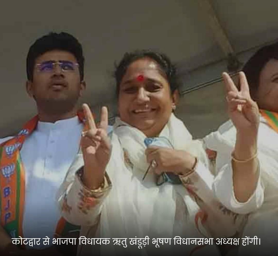 उत्तराखंड के पूर्व मुख्यमंत्री भुवन चंद्र खंडूड़ी की पुत्री और कोटद्वार से विधायक ऋतु खंडूड़ी भूषण विधानसभा अध्यक्ष होंगी। उत्तराखंड के इतिहास में पहली बार ऐसा होगा जब कोई महिला विधानसभा अध्यक्ष होंगी। उनको विधानसभा अध्यक्ष चुनने की प्रकिया जल्द होगी।