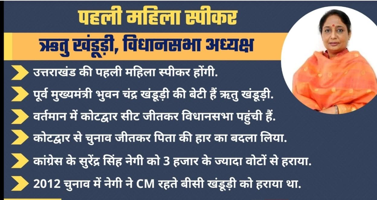 उत्तराखंड के राजनैतिक इतिहास में भाजपा ने नया अध्याय जोड़ा है। प्रदेश को ऋतु खंडूरी के रूप में पहली महिला स्पीकर मिली है। इस बार के विधानसभा चुनाव में कोटद्वार के दिग्गज कांग्रेस नेता सुरेंद्र सिंह नेगी को हराकर विधायक बनी ऋतु ने कई मिथक तोड़े हैं।