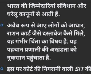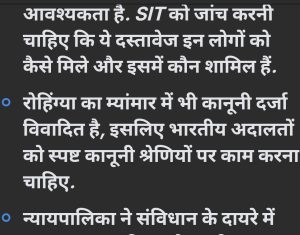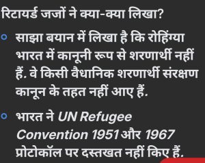 साझा बयान में लिखा है कि रोहिंग्या भारत में कानूनी रूप से शरणार्थी नहीं हैं. वे किसी वैधानिक शरणार्थी संरक्षण कानून में नहीं आए हैं.भारत UN Refugee Convention 1951 और 1967 प्रोटोकॉल हस्ताक्षरकर्ता नही हैं. भारत की जिम्मेदारियां संविधान और घरेलू कानूनों से आती हैं.अवैध रूप से आए लोगों को आधार, राशन कार्ड जैसे दस्तावेज कैसे मिले, यह गंभीर चिंता का विषय है. यह पहचान प्रणाली की अखंडता को नुकसान पहुंचाता है.इस पर कोर्ट की निगरानी वाली SIT की आवश्यकता है. SIT को जांचना चाहिए कि ये दस्तावेज इन लोगों को कैसे मिले और इसमें कौन शामिल हैं.रोहिंग्या का म्यांमार में भी कानूनी दर्जा विवादित है, इसलिए भारतीय अदालतों को स्पष्ट कानूनी श्रेणियों पर काम करना चाहिए.न्यायपालिका ने संविधान के दायरे में रहकर मानव गरिमा और राष्ट्रीय सुरक्षा दोनों का संतुलन बनाए रखा है. ऐसे में अमानवीयता का आरोप लगाना अनुचित और न्यायिक स्वतंत्रता को खतरा है.