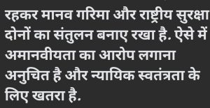 “बेंच की बातें बुनियादी संवैधानिक मूल्यों के खिलाफ हैं। इनका असर रोहिंग्या रिफ्यूजियों को अमानवीय बनाने का है, जिनकी बराबर इंसानियत और बराबर मानवाधिकार संविधान, हमारे कानूनों और इंटरनेशनल कानूनों से सुरक्षित हैं।” बेंच के बयानों जिसमें रोहिंग्या के रिफ्यूजी के तौर पर कानूनी दर्जे पर सवाल उठाए गए, उनकी तुलना भारत में गैर-कानूनी तरीके से घुसने वाले घुसपैठियों से की गई, उन लोगों का ज़िक्र किया गया, जो गैर-कानूनी तरीके से घुसने के लिए सुरंग खोदते हैं, सवाल किया गया कि क्या ऐसे लोग खाना, रहने की जगह और पढ़ाई के हकदार हैं, रिफ्यूजी को संविधान से मिले बुनियादी हकों से इनकार करने के लिए घरेलू गरीबी का हवाला दिया गया और यह सुझाव दिया गया कि भारत में उनके साथ होने वाले बर्ताव में उन्हें थर्ड डिग्री के तरीकों से बचाया जाए।