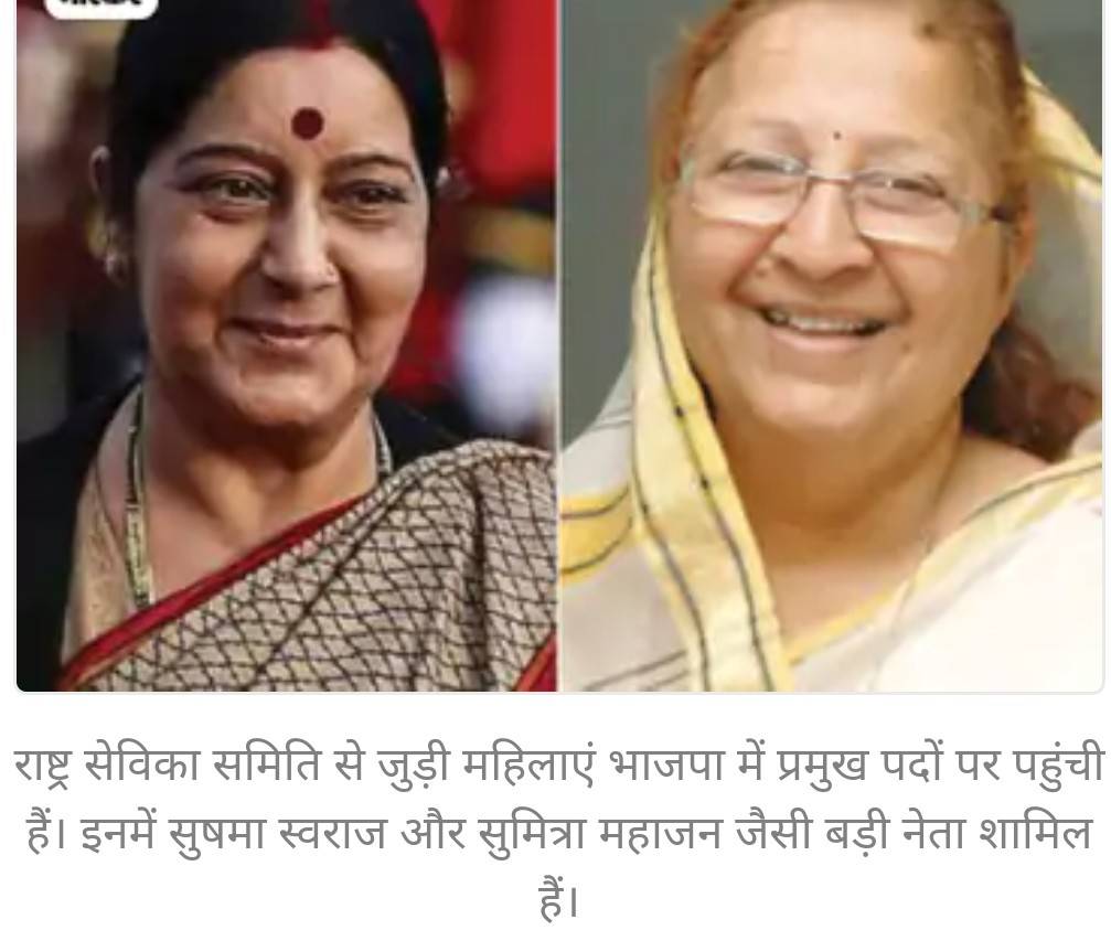 राष्ट्र सेविका समिति से जुड़ी महिलाएं भाजपा में प्रमुख पदों पर पहुंची हैं। इनमें सुषमा स्वराज और सुमित्रा महाजन जैसी बड़ी नेता शामिल हैं।