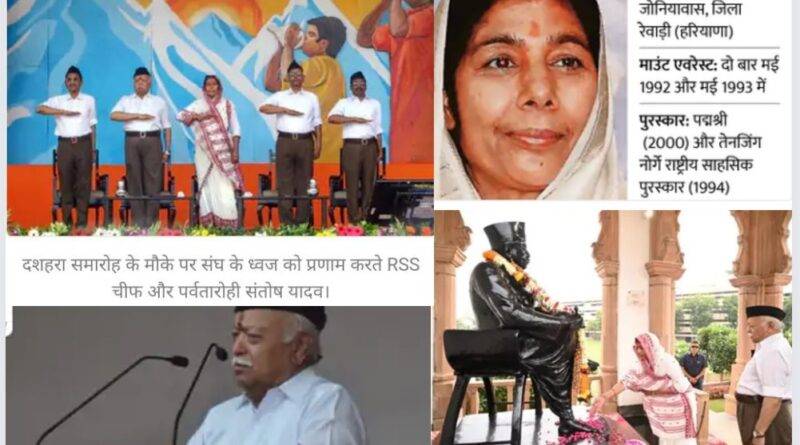 दशहरा समारोह के मौके पर संघ के ध्वज को प्रणाम करते RSS चीफ और पर्वतारोही संतोष यादव।
