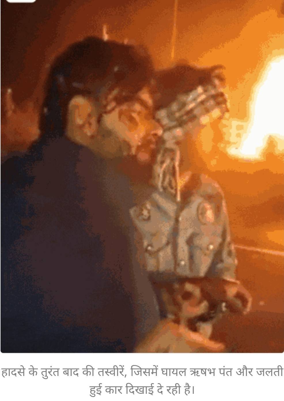 दुर्घटना के तुरंत बाद की तस्वीरें, जिसमें घायल ऋषभ पंत और जलती हुई कार दिखाई दे रही है।