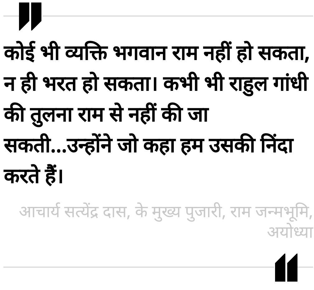 अयोध्या में राम जन्मभूमि के मुख्य पुजारी आचार्य सत्येंद्र दास ने सलमान खुर्शीद के बयान की निंदा करते कहा कि कोई व्यक्ति भला भगवान कैसे हो सकता है? आचार्य बोले, ‘कोई भी व्यक्ति भगवान राम नहीं हो सकता, न ही भरत हो सकता। कभी भी राहुल गांधी की तुलना राम से नहीं की जा सकती…उन्होंने जो कहा हम उसकी निंदा करते हैं।’ वहीं, तपस्वी छावनी के संत परमहंस ने आक्रोश जाहिर करते हुए खुर्शीद को फटकार लगाई। उन्होंने कहा,’ये सोच रहे हैं कि रामलीला का अभिनय शुरू करे, शायद जनता माफ कर दे। राहुल गांधी के मुंह से तो कभी जय श्रीराम नहीं सुना। जय श्रीराम बोलिए। रामभक्त बनने का मतलब क्या है, जय श्रीराम बोलिए।’