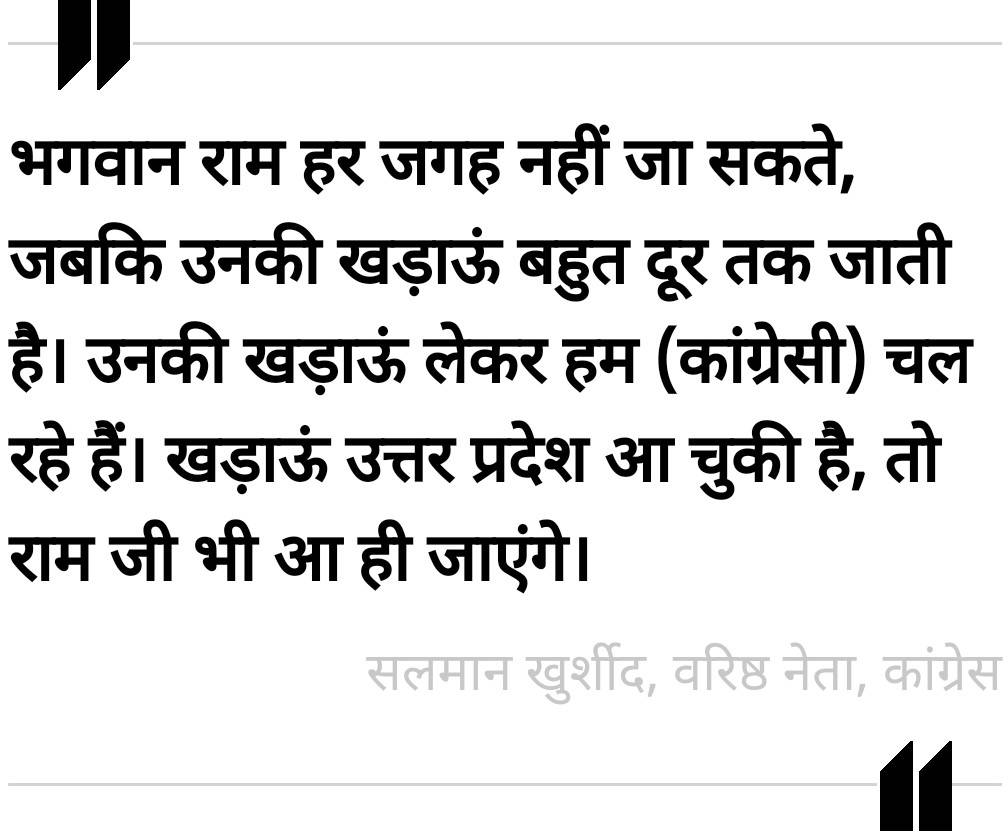 ध्यान रहे कि उत्तर प्रदेश के मुरादाबाद स्थित सर्किट हाउस में सोमवार को पहुंचे सलमान खुर्शीद ने कहा कि राहुल गांधी की ‘भारत जोड़ो यात्रा’ के उत्तर प्रदेश में व्यापक रूप से न आने के सवाल पर खुर्शीद ने कहा, ‘भगवान राम हर जगह नहीं जा सकते, जबकि उनकी खड़ाऊं बहुत दूर तक जाती है। उनकी खड़ाऊं लेकर हम (कांग्रेसी) चल रहे हैं। खड़ाऊं उत्तर प्रदेश आ चुकी है, तो राम जी भी आ ही जाएंगे।’ खुर्शीद ने कहा, ‘राहुल गांधी एक ‘योगी’ की तरह तपस्या कर रहे हैं।’ उन्होंने कहा, ‘राहुल गांधी की क्षमता सीमित नहीं है। वो ‘सुपर ह्यूमन’ हैं। कड़ाके की सर्दी में टीशर्ट पहने निकलते हैं और कहते हैं कि तपस्या कर रहा हूं।’ खुर्शीद ने भाजपा पर नफरत की राजनीति करना का आरोप लगाया। उन्होंने कहा कि भाजपा नफरत फैलाकर देश को तोड़ रही है। कुछ लोगों ने यहां तक कह दिया कि दूसरे देश चले जाओ, यह देश की मानसिकता को खंडित करने की कोशिश है। सलमान खुर्शीद उत्तर प्रदेश में ‘भारत जोड़ो यात्रा’ के संयोजक हैं।