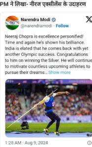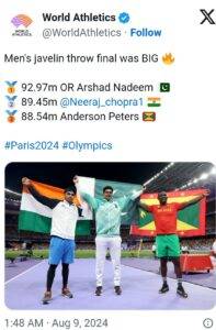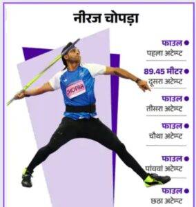 टोक्यो ओलंपिक के स्वर्ण पदक विजेता भारतीय एथलीट नीरज चोपड़ा पेरिस में अपना प्रदर्शन नहीं दोहरा सके और उन्हें रजत पदक से संतोष करना पड़ा। पाकिस्तान के नदीम ने अपने दूसरे प्रयास में 92.97 मीटर का रिकॉर्ड थ्रो कर स्वर्ण पदक अपने नाम किया। वहीं, नीरज चोपड़ा ने दूसरे प्रयास में 89.45 मीटर के सर्वश्रेष्ठ थ्रो के साथ रजत और ग्रेनाडा के एंडरसन पीटर्स 88.54 मीटर के सर्वश्रेष्ठ थ्रो के साथ तीसरे स्थान पर रहे। नीरज और नदीम ने फाउल के साथ शुरुआत की थी, लेकिन पाकिस्तान के नदीम ने दूसरे प्रयास में ओलंपिक का रिकॉर्ड तोड़ते हुए अपनी दावेदारी मजबूत कर ली। नीरज ने भी दूसरे प्रयास में अपने इस सत्र का सर्वश्रेष्ठ प्रदर्शन किया, लेकिन वह नदीम से आगे नहीं निकल सके।