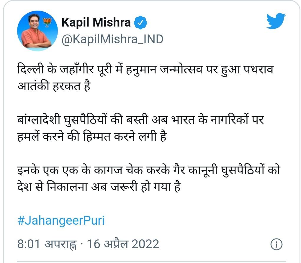 वहीं इस मामले पर अब राजनीतिक प्रतिक्रियाएं आनी शुरू हो गई हैं। बीजेपी नेता कपिल मिश्रा ने ट्वीट कर कहा, “दिल्ली के जहांगीरपुरी में हनुमान जन्मोत्सव पर हुआ पथराव आतंकी हरकत है। बांग्लादेशी घुसपैठियों की बस्ती अब भारत के नागरिकों पर हमलें करने की हिम्मत करने लगी है। इनके एक एक के कागज चेक करके गैर कानूनी घुसपैठियों को देश से निकालना अब जरूरी हो गया है।”