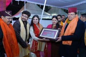मुख्यमंत्री ने भजन गायिका स्वाति मिश्रा को सम्मानित करते हुये भगवान राम के प्रति उनकी आस्था से परिपूर्ण गायिकी की भी प्रशंसा की।