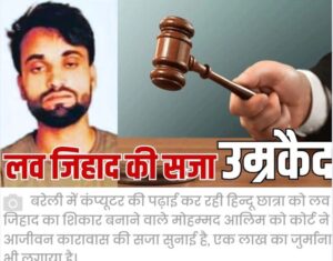 लव जिहाद के चर्चित मामले में बरेली के फास्ट ट्रैक कोर्ट प्रथम के जज रवि कुमार दिवाकर ने मोहम्मद आलिम को उम्रकैद की सजा ,पिता साबिर को दो साल कैद के साथ आलिम पर एक लाख रुपये का जुर्माना भी लगाया। कोर्ट ने फैसले में लव जिहाद को परिभाषित करते हुए कहा कि धर्मांतरण से पाकिस्तान-बांग्लादेश की तरह भारत को अस्थिर करने का षड्यंत्र चल रहा है और यह सब देश की एकता, अखंडता और संप्रभुता को खतरा है।