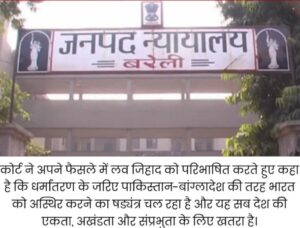 बरेली कोर्ट ने फैसले में कहा है कि यदि समय रहते भारत सरकार ने लव जिहाद से अवैध धर्मांतरण पर रोक नहीं लगाई तो भविष्य में इसके गंभीर परिणाम देश को भुगतने पड़ सकते हैं।