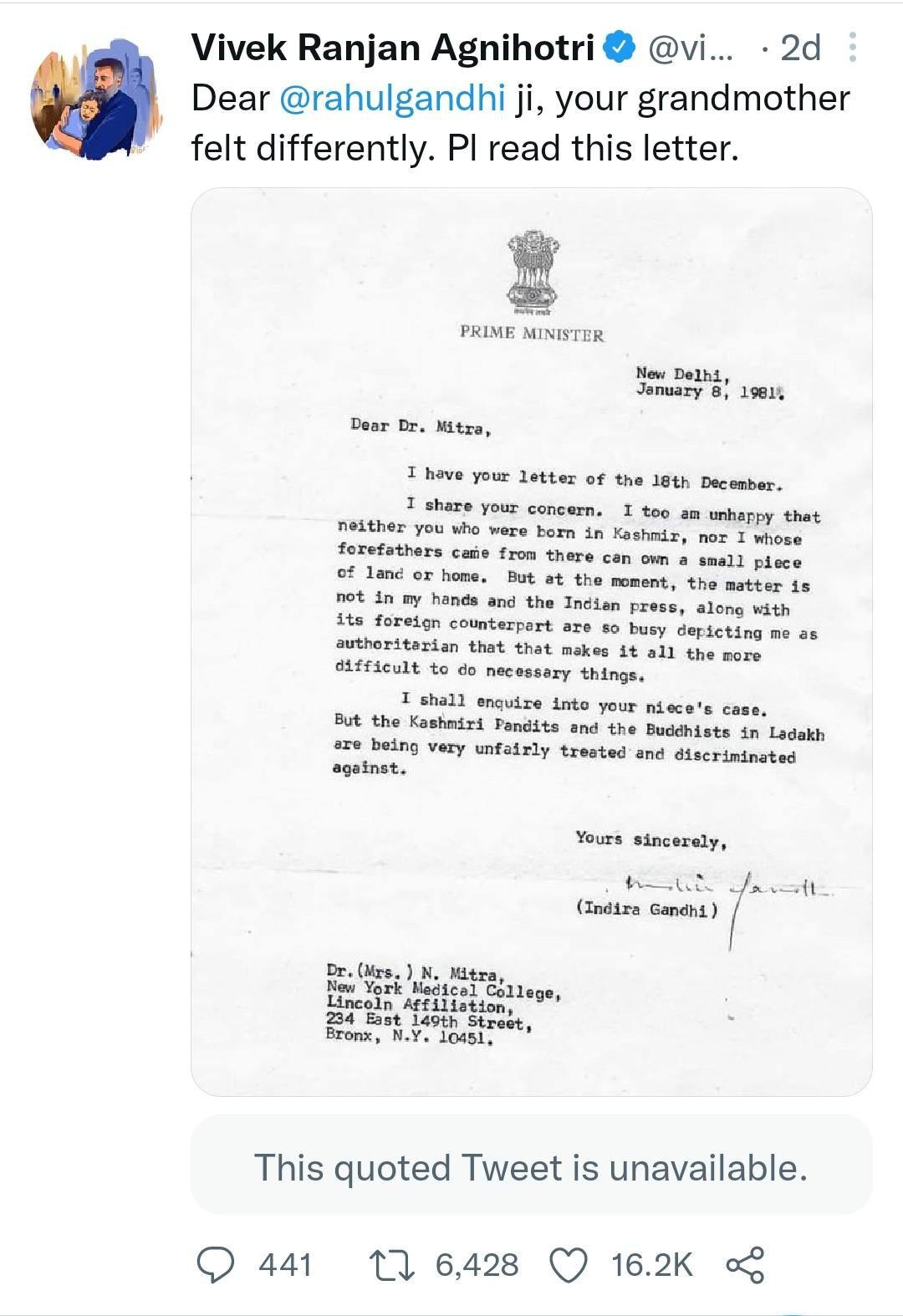 इसी बीच ‘द कश्मीर फाइल्स’ के डायरेक्टर विवेक रंजन अग्निहोत्री (Vivek Ranjan Agnihotri) ने ट्विटर पर पूर्व प्रधानमंत्री इंदिरा गांधी का एक पत्र साझा किया है। यह पत्र उन्होंने 8 जनवरी, 1981 को न्यूयार्क में रहने वाले कश्मीरी पंडित डाक्टर एन मित्रा को लिखा था। दरअसल डा मित्रा ने कश्मीर में रह रही अपनी भतीजी के अचानक लापता हो जाने पर तत्कालीन प्रधानमंत्री इंदिरा गांधी को चिट्ठी लिखी थी। इसके जवाब में इंदिरा गांधी ने उन्हें पत्र भेजा था। फिल्म डायरेक्टर ने इंदिरा गांधी के इसी पत्र का स्क्रीन शाट ट्विटर पर शेयर करते हुए लिखा, ‘प्रिय राहुल गांधी जी, आपकी दादी की राय अलग थी। हालांकि, केरल कांग्रेस के इस ट्वीट पर अभी तक राहुल गांधी, सोनिया या प्रियंका गांधी वाड्रा की ओर से अब तक कोई टिप्पणी नहीं आई है। उनकी चुप्पी पर भी सियासत शुरू हो गई है।