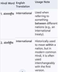 बोलचाल और सामान्य लेखन में अब अधिकतर लोग अंतरराष्ट्रीय (No. 1) का ही प्रयोग “International” के लिए करते हैं। अगर आप किसी परीक्षा की तैयारी कर रहे हैं, तो “International” के लिए अंतरराष्ट्रीय ही सबसे सटीक विकल्प माना जाएगा।