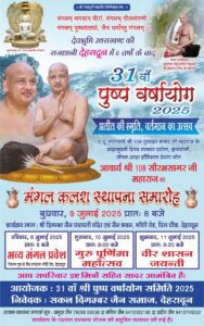 विदित रहे,महामुनिराज आचार्य सौरभ सागर देहरादून 2019 के बाद छह जुलाई को 31वें पुष्प वर्षायोग के लिए देहरादून पहुंचे हैं।उनका स्वागत महापौर सौरभ थपलियाल ने किया। उत्तराखंड शासन ने उन्हे राजकीय अतिथि घोषित किया है.बुधवार नौ जुलाई को प्रात: आठ बजे श्री दिगंबर जैन पंचायती मंदिर और जैन भवन धर्मशाला में मंगल कलश स्थापना समारोह होगा जिसमें मुख्य अतिथि मुख्यमंत्री पुष्कर सिंह धामी और विशिष्ट अतिथि विधायक द्वय विनोद चमोली और खजानदास रहेगें।