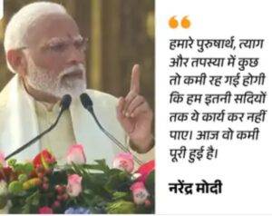 प्रधानमंत्री मोदी ने कहा कि गुलामी की मानसिकता को तोड़कर उठ खड़ा हुआ है राष्ट्र। अतीत के हर दंश से साहस लेता हुआ राष्ट्र ऐसे ही नव इतिहास का सृजन करता है। आज से हजार साल बाद भी लोग आज की इस तारीख की, आज के इस पल की चर्चा करेंगे। अयोध्या ने लंबा वियोग सहा है। हमारी कई पीढ़ियों ने वियोग सहा है। प्रभु राम के अस्तित्व को लेकर कानूनी लड़ाई चली। न्यायपालिका का आभार कि उन्होंने न्याय की लाज रख ली।