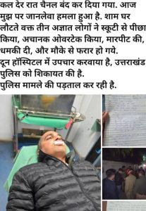 देहरादून में पत्रकार पर हमला, पत्रकार संगठनों ने की हमलावरों के खिलाफ कठोर कार्रवाई की मांग
