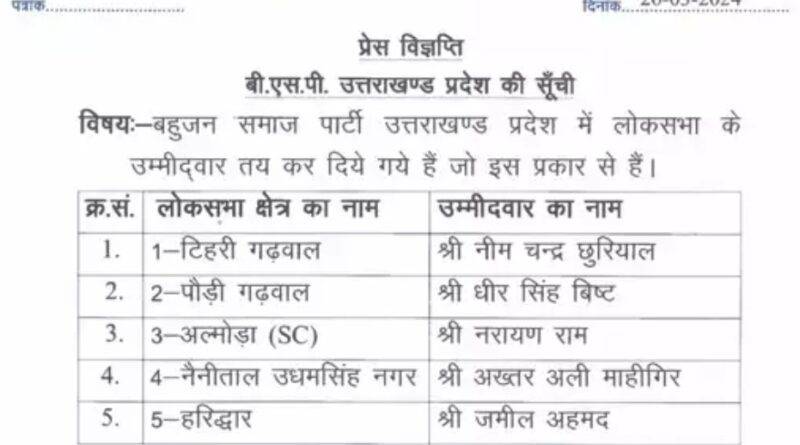 बहुजन समाज पार्टी ने टिहरी गढ़वाल लोकसभा सीट से नीम चंद्र छुरियाल को उम्मीदवार बनाया गया है। इसके साथ ही पौड़ी गढ़वाल सीट से धीर सिंह बिष्ट को प्रत्याशी घोषित किया गया है। जबकि अल्मोड़ा SC सीट से नरायण राम को कैंडिडेट घोषित किया है। वहीं नैनीताल उधमसिंह नगर लोकसभा सीट से बसपा के टिकट पर अख्तर अली माहीगिर चुनावी मैदान में ताल ठोकेंगे। इसके अलावा हरिद्वार सीट से बसपा ने मुजफ्फरनगर के जमींदार जमील अहमद कासमी को प्रत्याशी बनाया है।