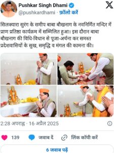 धामी ने कहा कि टनल निर्माण में 12 नवम्बर को अचानक हुए भूस्खलन में 41 श्रमिक फँस गए थे। तब देशभर से लोग इन श्रमिकों की कुशलता को ईश्वर से प्रार्थना कर रहे थे। उस अँधेरी सुरंग में, जहाँ उम्मीद की किरणें भी धूमिल हो रही थी, बाबा बौखनाग ने पहाड़ों के रक्षक के रूप में शक्ति और विश्वास का संचार किया।