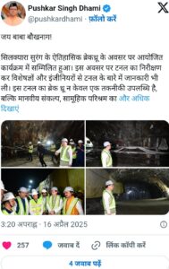 उत्तराखंड के उत्तरकाशी जिले में यमुनोत्री हाईवे पर निर्माणाधीन चर्चित सिलक्यारा टनल कामुख्यमंत्री पुष्कर सिंह धामी की मौजूदगी में सफल ब्रेक थ्रू किया। मुख्यमंत्री धामी ने कहा कि टनल के आरपार होने के बाद आने वाले समय में जल्द ही यहां से चारधाम यात्री वाहनों की आवाजाही शुरू होगी।