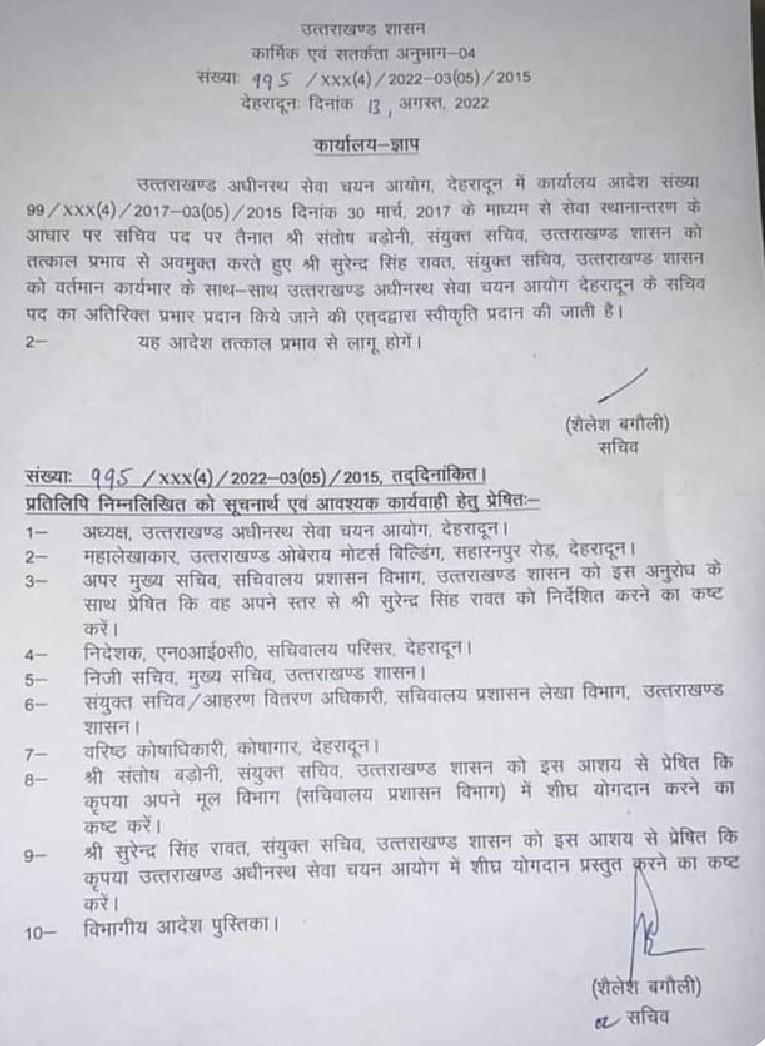 उनके स्थान पर सचिवालय में संयुक्त सचिव सुरेंद्र सिंह रावत को आयोग में सचिव पद की अतिरिक्त जिम्मेदारी सौंपी गई है। साथ में आयोग में लंबे समय से रिक्त चल रहे परीक्षा नियंत्रक के पद पर पीसीएस अधिकारी शालिनी नेगी को तैनात किया गया है।