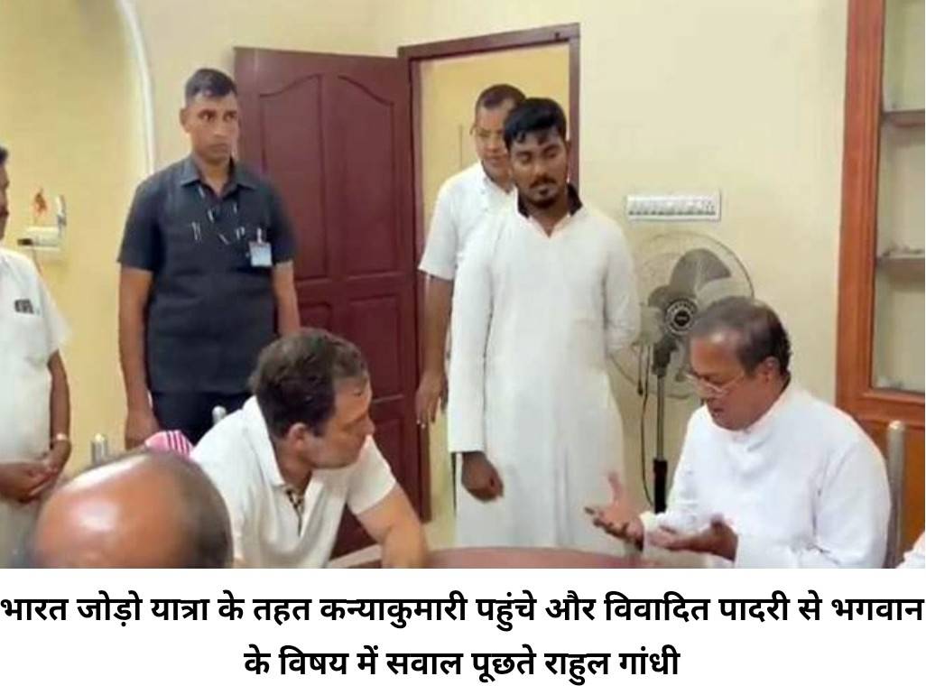 बीते दिनों अपनी भारत जोड़ो यात्रा के सिलसिले में राहुल गांधी तमिलनाडु थे. जहां विवाद तब हुआ जब उन्होंने अक्सर ही अपनी बातों से हिंदू धर्म को टारगेट करने वाले विवादित पादरी जॉर्ज पोनइया से मुलाकात की और एक ऐसा सवाल पूछा जिसके जवाब ने विवाद की आग को हवा दे दी. कन्याकुमारी के मुट्टीडिचन पराई चर्च में राहुल गांधी और पादरी की बातचीत हुई. राहुल गांधी ने पादरी से पूछा कि यीशु मसीह भगवान का एक रूप है? क्या यह सही है?” उनके इस सवाल पर पादरी जॉर्ज पोन्निया ने कहा, ‘नहीं, वही असली भगवान हैं.’