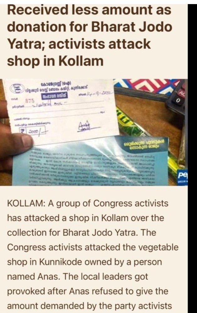 @ANI @RahulGandhi @republic @TimesNow @IndiaToday @BJPInNews@AskAnshul @INCKerala @vdsatheesanCongress member attack a vegetable shop and destroy their weighing machine worth 8000 Rs for not paying donation of Rs 2000 for Bharath Jodo Yatra at Kunnikodu / Kerala. pic.twitter.com/Gds6gnR7VI