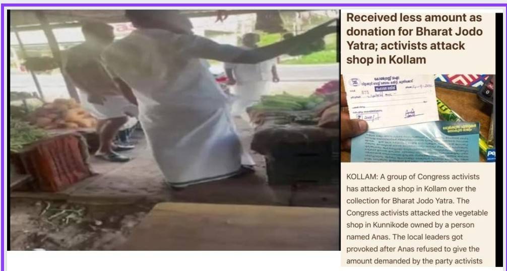 बात राहुल गांधी की भारत जोड़ो यात्रा और यात्रा के चलते विवादों की हो रही है तो सबसे ताजे में हम केरल की घटना का जिक्र करना चाहेंगे. कोल्लम जिले में एक सब्जीवाले ने कांग्रेस कार्यकर्ताओं पर धमकाने का आरोप लगाया है. सब्जी का व्यापार करने वाले व्यक्ति का आरोप था कि कोल्लम में भारत जोड़ोअभियान के लिए कांग्रेस पार्टी चंदे की रकम जुटा रही है. सब्जी वाले के मुताबिक कांग्रेस पार्टी के लोग चंदे के लिए उसके पास भी आए और उससे दो हजार रुपये मांगे गए थे. पैसे ना देने पर उसके साथ मारपीट की गई. घटना का वीडियो इंटरनेट पर जंगल की आग की तरह वायरल हो रहा है.