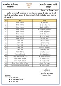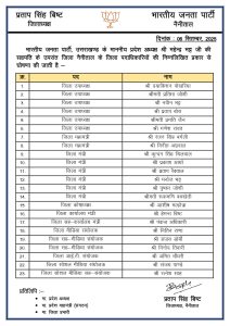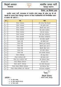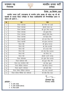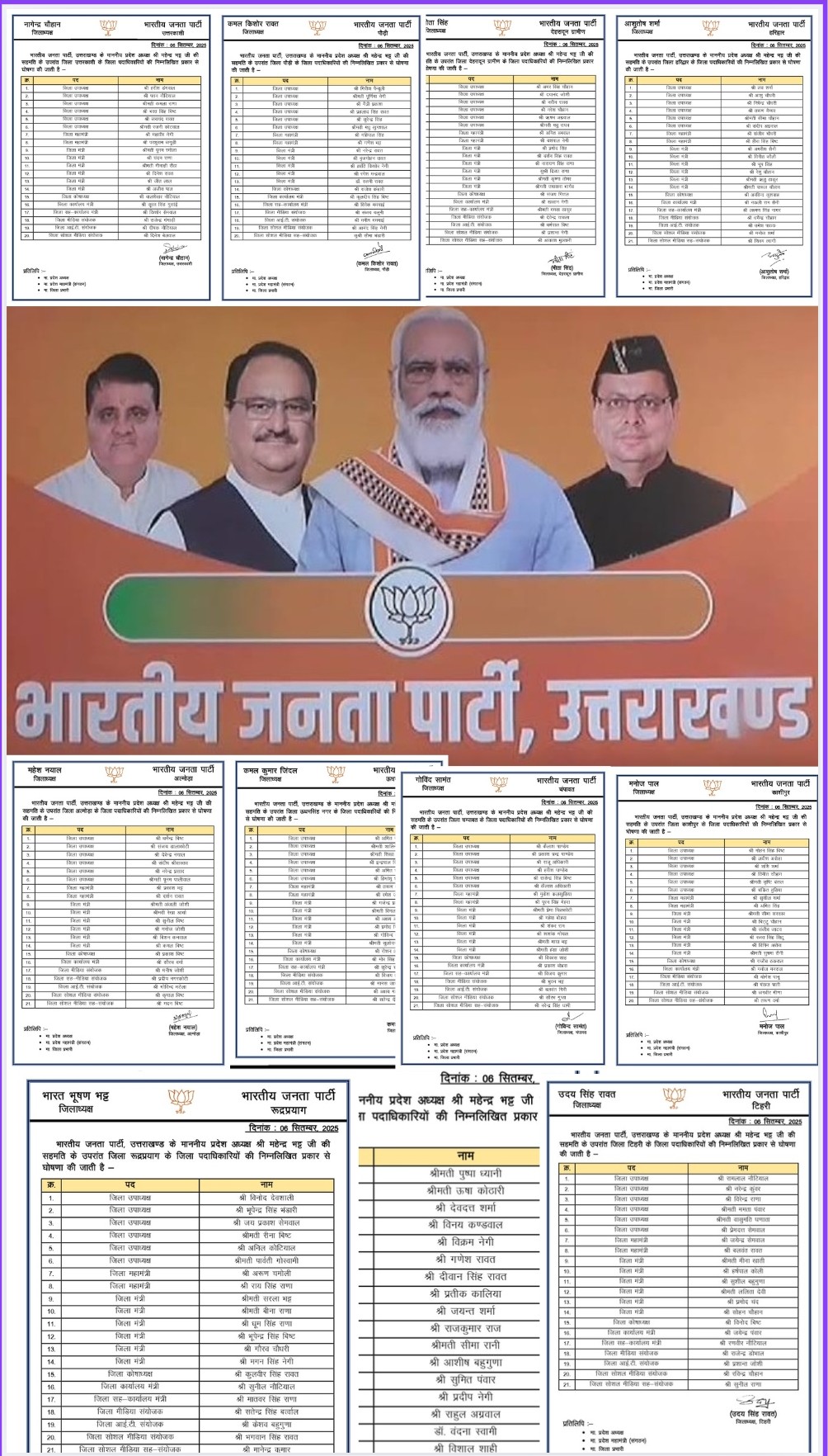 देहरादून 06 सितंबर 2025। भारतीय जनता पार्टी ने 16 जिलों की कार्यकारिणी घोषित कर दी है । तीन जिलों की बाद में घोषित की जाएगी। संगठन ने जिलों में टीम को मजबूत करने के लिए उपाध्यक्ष, महामंत्री, जिलामंत्री, कोषाध्यक्ष से लेकर कार्यालय मंत्री, सह-कार्यालय मंत्री, मीडिया संयोजक, आईटी संयोजक, सोशल मीडिया संयोजक, सोशल मीडिया सह-संयोजक के पदों पर पदाधिकारी नियुक्त कर दिए हैं।