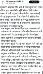 मुख्यमंत्री के निर्देश पर कार्मिक विभाग ने आज हरिद्वार नगर निगम के तत्कालीन प्रशासक और मौजूदा जिलाधिकारी कर्मेंद्र सिंह, तत्कालीन नगर आयुक्त वरुण चौधरी, हरिद्वार के तत्कालीन परगनाधिकारी अजयवीर सिंह, वरिष्ठ वित्त अधिकारी निकिता बिष्ट, वरिष्ठ वैयक्तिक सहायक विक्की, रजिस्ट्रार कानूनगो राजेश कुमार, हरिद्वार तहसील के मुख्य प्रशासनिक अधिकारी कमलदास को निलंबित कर दिया है।