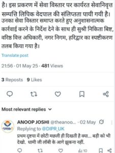 मामले में सेवा विस्तार पाये सेवानिवृत्त संपत्ति लिपिक वेदपाल भी शामिल पाये गये. उनका सेवा विस्तार समाप्त कर अनुशासनात्मक कार्रवाई के निर्देश हुए. साथ ही नगर निगम की वरिष्ठ वित्त अधिकारी निकिता बिष्ट से स्पष्टीकरण मांगा गया. जांच पूरी कर जांच अधिकारी IAS अधिकारी रणवीर सिंह ने रिपोर्ट शासन को सौंपी. रिपोर्ट के आधार पर ताजा फैसला आया है.