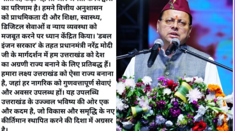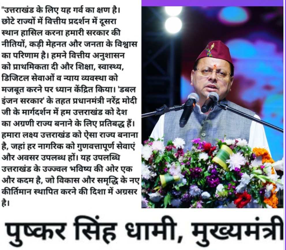*“उत्तराखंड के लिए यह गर्व का क्षण है। छोटे राज्यों में वित्तीय प्रदर्शन में दूसरा स्थान हासिल करना हमारी सरकार की नीतियों, कड़ी मेहनत और जनता के विश्वास का परिणाम है। हमने वित्तीय अनुशासन को प्राथमिकता दी और शिक्षा, स्वास्थ्य, डिजिटल सेवाओं व न्याय व्यवस्था को मजबूत करने पर ध्यान केंद्रित किया। ‘डबल इंजन सरकार’ के तहत प्रधानमंत्री नरेंद्र मोदी जी के मार्गदर्शन में हम उत्तराखंड को देश का अग्रणी राज्य बनाने के लिए प्रतिबद्ध हैं। हमारा लक्ष्य उत्तराखंड को ऐसा राज्य बनाना है, जहां हर नागरिक को गुणवत्तापूर्ण सेवाएं और अवसर उपलब्ध हों। यह उपलब्धि उत्तराखंड के उज्ज्वल भविष्य की ओर एक और कदम है, जो विकास और समृद्धि के नए कीर्तिमान स्थापित करने की दिशा में अग्रसर है।*