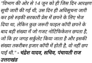 गजट नोटिफिकेशन न छापने के पीछे किसकी लापरवाही है? इस पर जवाब देते हुए पंचायत राज सचिव चंद्रेश कुमार ने कहा कि कई बार ऐसा होता है कि सरकार के कई विभागों की अधिसूचनाओं को एक साथ रुड़की प्रेस में भेजा जाता है. रुड़की प्रेस जब कुछ गजट नोटिफिकेशन इकट्ठे हो जाते हैं तो एक साथ उन्हें छापती है, इस केस में भी 14 जून को ही रुड़की प्रेस में अधिसूचना भेज दी गई थी, लेकिन प्रेस की तरफ से छपने में देरी हुई है.