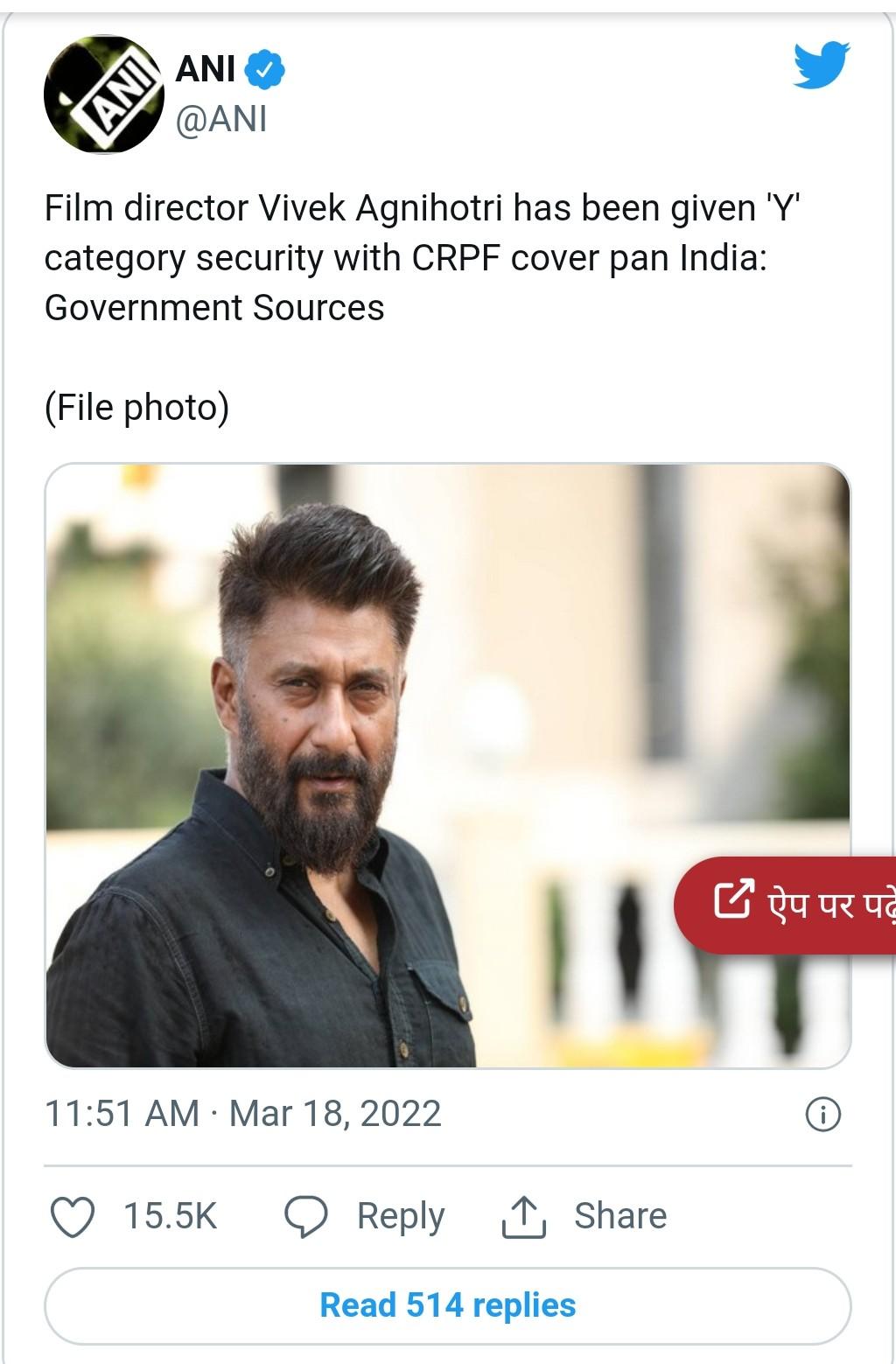 नई दिल्ली18मार्च: कश्मीरी पंडितों की कहानी पर आधारित फिल्म ‘The Kashmir Files’ इन दिनों काफी सुर्खियों में है. ये फिल्म निर्देशक विवेक अग्निहोत्री ने डायरेक्ट की है. एक और जहां लोग इस फिल्म का पसंद कर रहे हैं तो वहीं कई लोग इसके विरोध में भी हैं. इसे देखते हुए सरकार ने विवेक अग्निहोत्री को पूरे भारत में सीआरपीएफ कवर के साथ ‘वाई’ श्रेणी की सुरक्षा दी गई है.