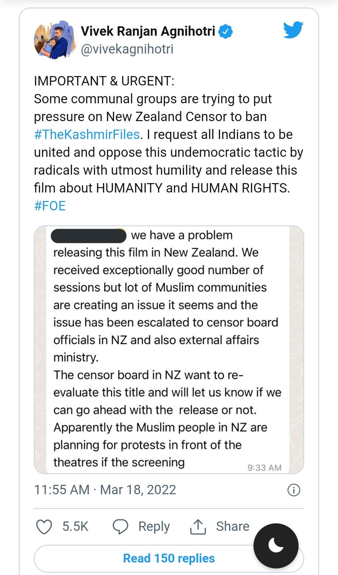 अब विवेक रंजन अग्निहोत्री में एक स्क्रीनशॉट शेयर करते हुए ट्वीट किया, “कुछ सांप्रदायिक समूह #TheKashmirFiles पर प्रतिबंध लगाने के लिए न्यूज़ीलैंड के सेंसर बोर्ड पर दबाव बनाने की कोशिश कर रहे हैं। मैं सभी भारतीयों से एकजुट होने और कट्टरपंथियों द्वारा इस अलोकतांत्रिक रणनीति का अत्यंत विनम्रता के साथ विरोध करने और मानवता और मानवाधिकारों की रक्षा हेतु इस फिल्म को रिलीज करने का अनुरोध करता हूँ।”