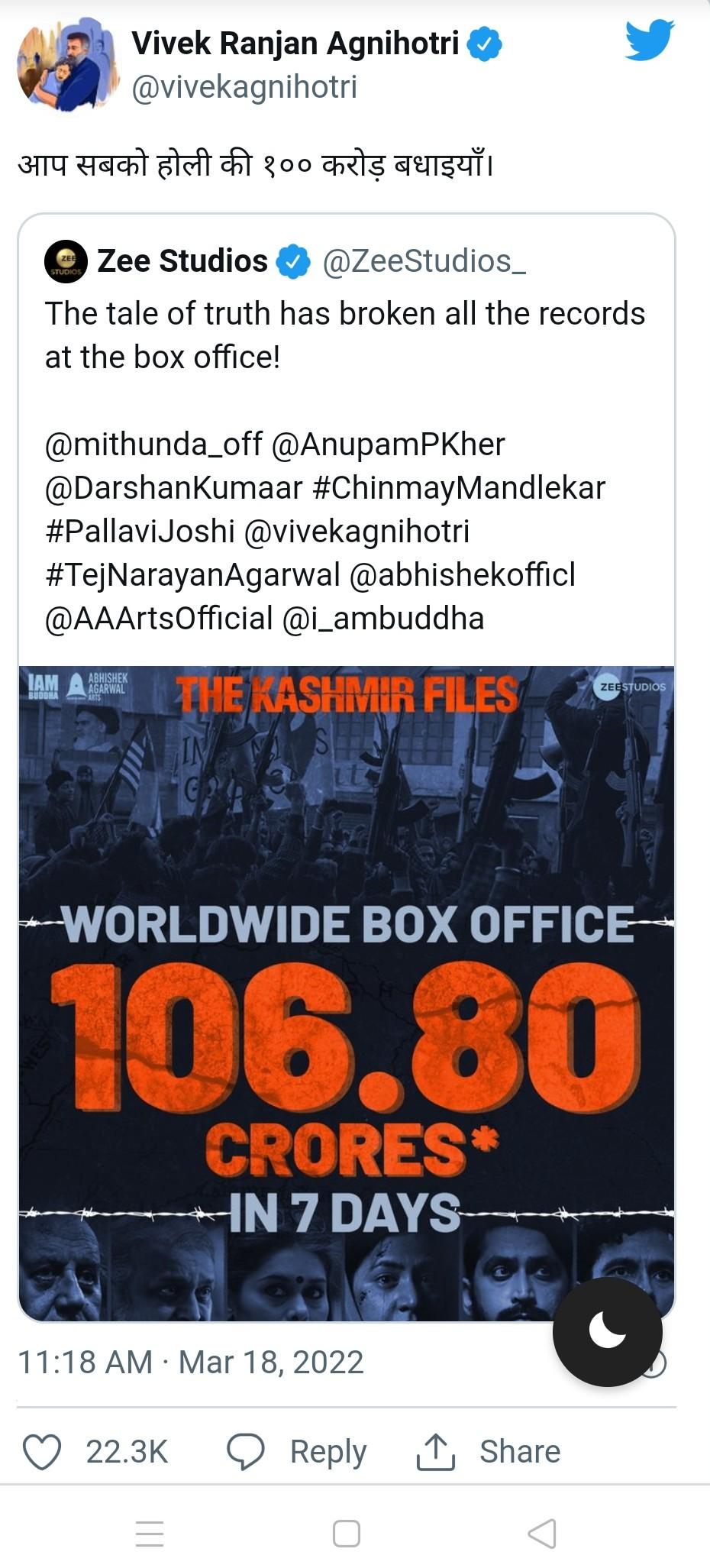 गौरतलब है कि कश्मीरी पंडितों की कहानी पर आधारित फिल्म ‘The Kashmir Files’ में साल 1990 में हुए कश्मीरी पंडितों के नरसंहार के एक छोटे हिस्से को दिखाया गया है। देश-विदेश के ज्यादातर शहरों के सिनेमाघरों में शो हाउसफुल चल रहे हैं। फिल्म के माध्यम से विवेक अग्निहोत्री ने कश्मीरी पंडितों पर हुए हिंसा की दास्तान को घर-घर तक पहुँचा दिया है।