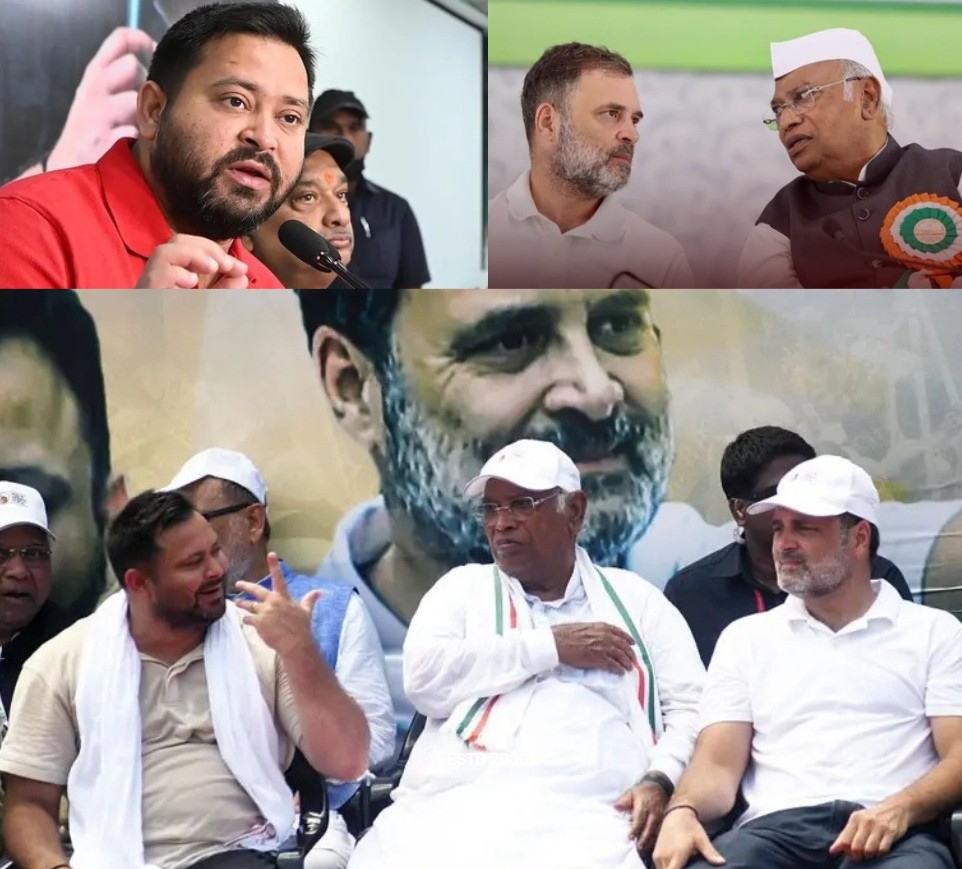 तेजस्वी यादव, मल्लिकार्जुन खड़गे और राहुल गांधी