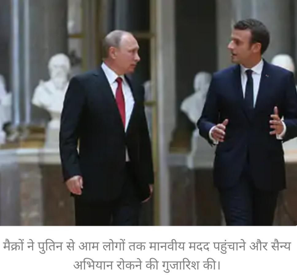 मैक्रों ने पुतिन से आम लोगों तक मानवीय मदद पहुंचाने और सैन्य अभियान रोकने की गुजारिश की।